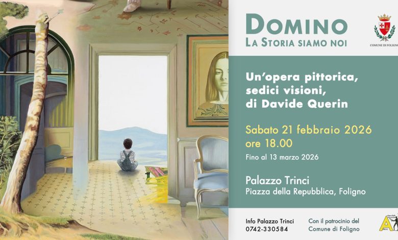 “Domino – La Storia siamo noi” è il titolo del progetto espositivo di Davide Querin che arriva in mostra a Palazzo Trinci di Foligno (21 febbraio – 13 marzo). Arte contemporanea che nasce dall’estro creativo dell’artista romano, conosciuto soprattutto come il pittore delle trasparenze, che si unirà quindi in maniera suggestiva alle già ricche, di storie, sale affrescate dello spazio cuore civico e museale della città umbra.